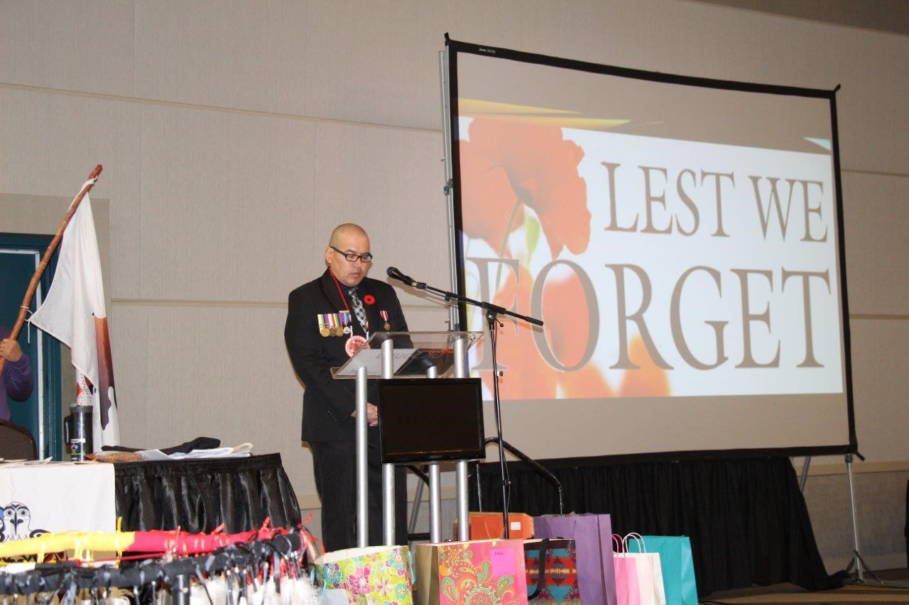 On Wednesday, November 8, in honor or National Aboriginal Veterans Day, Veterans from the region were honored through ceremony with blanketing and a song. Delegates acknowledged attending veterans through handshakes, hugs and expressions of gratitude.