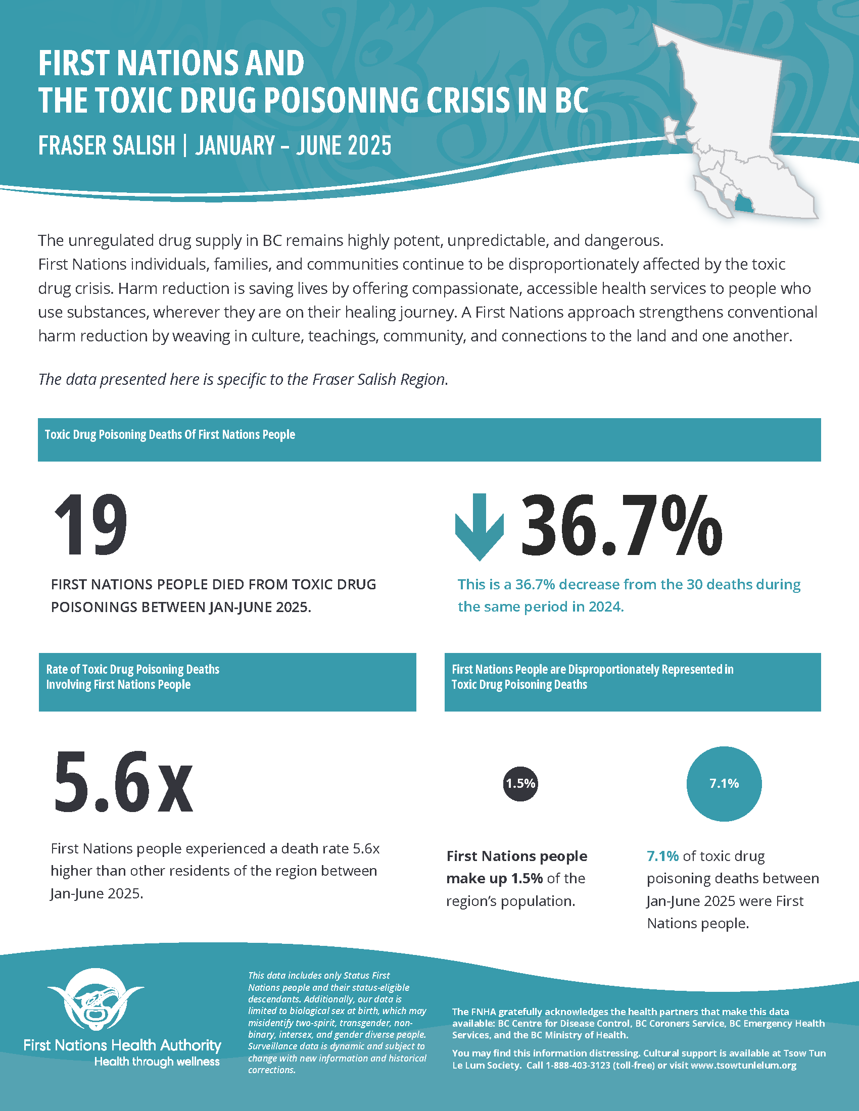 The FNHA works closely with health partners to gather data about the impacts of the toxic drug supply on First Nations people in BC. Indigenous people who are not recognized as having First Nations status under the Indian Act are unfortunately not represented in this data. The FNHA is committed to working with provincial partners towards meaningful, systemic change that will make more inclusive data collection possible.